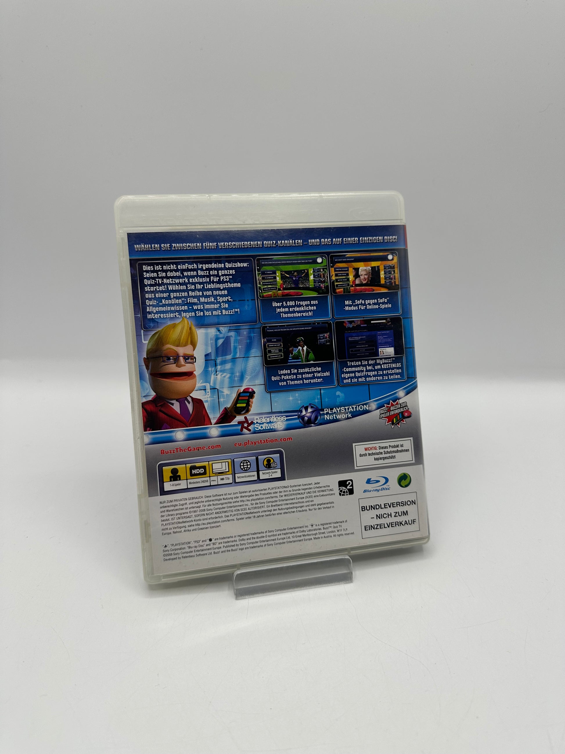 Buzz! Quiz TV ist ein unterhaltsames Quizspiel für die PlayStation 3 und richtet sich an Spieler, die ihr Wissen in verschiedenen Themengebieten testen möchten. Moderiert vom virtuellen Quizmaster „Buzz“ treten bis zu vier Spieler gegeneinander an und beantworten Fragen aus Kategorien wie Film, Musik, Sport oder Allgemeinwissen.